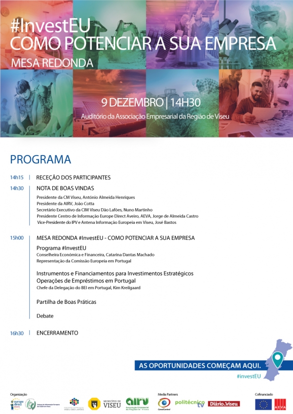 O Centro de Informação Europe Direct de Aveiro e a Antena de Informação Europeia em Viseu-Instituto Politécnico de Viseu promovem em parceria com a Comunidade Intermunicipal Viseu Dão Lafões, a Câmara Municipal de Viseu e a Associação Empresarial da Região de Viseu, a Mesa Redonda ‘#InvestEU-Como potenciar a sua empresa’, no dia 9 de dezembro, às 14h30, no Auditório da AIRV, em Viseu, destinada a empresários e demais públicos interessados.